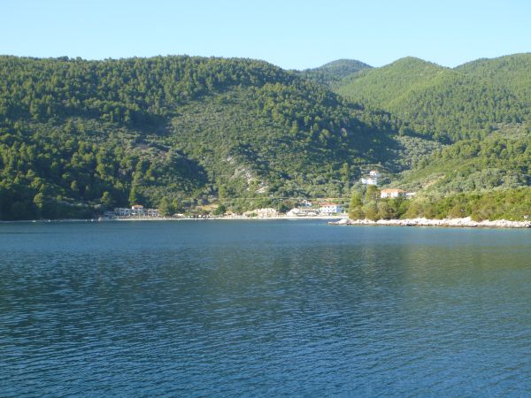 Nach Nea Klima und Glossa von den ersten beiden Besuchen auf Skopelos steht diesmal Ormos Panormos (Bucht für alle Winde) südlich von Nea Klima auf dem Programm. Und tatsächlich scheint die Bucht zu halten was sie verspricht. Sobald Sioned um die Ecke biegt reduziert sich der Wind auf handliche 3 kn.