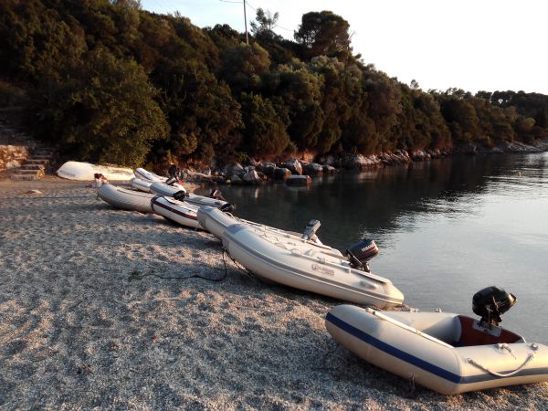 Die Tavernen in der Hauptbucht werden von den Ankerliegern gerne frequentiert, wie man an dieser abendlichen Dinghyparade sehen kann: