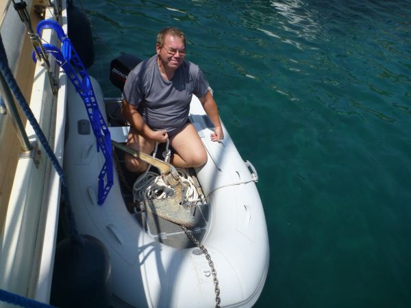 Ob des angekündigten Windes bringe ich sicherheitshalber noch einen zweiten Anker nach Luv aus. Diesmal den alten 23 kg CQR, der ursprünglich der Hauptanker von Sioned war. Daran 10m Kettenvorlauf und ein 12kg Reitgewicht auf die Leine (vorallem um nicht den halben Hafen zu blockieren). Das sollte wohl halten.