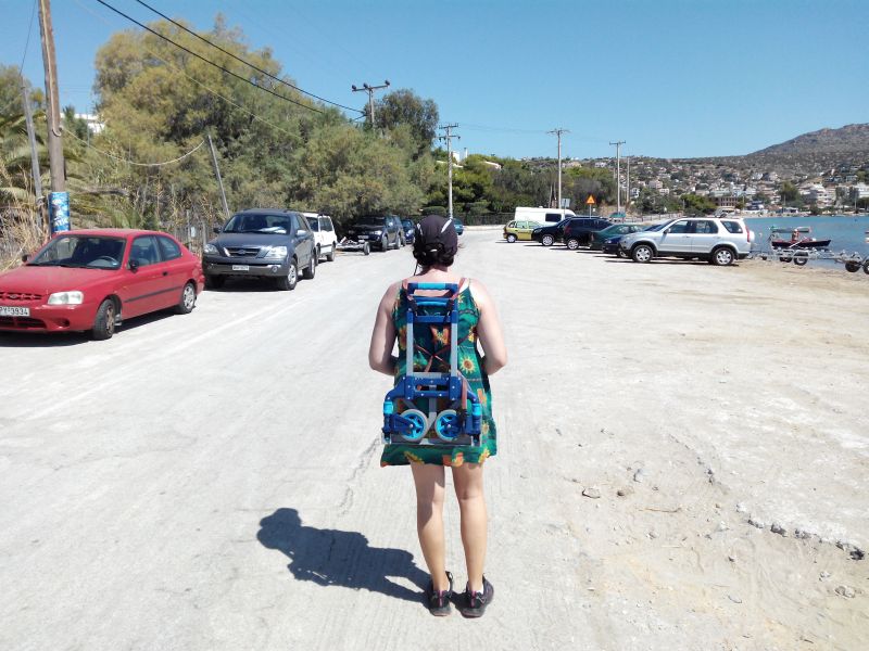Hier betrete ich zum ersten Mal attischen Boden. K benötigt dringend eine neue Melone und rüstet sich für den Transport des 11kg Klunkers entsprechend aus: