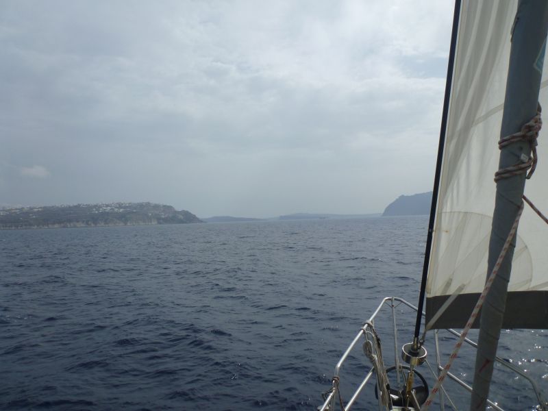 Leider ist Thira für Segler völlig ungeeignet, wie wir feststellen müssen. Der Meeresgrund fällt nur wenige Meter vom Ufer entfernt bereits auf über 300m ab und die wenigen Buchten und Felseinschnitte sind mit Moorings zugepflastert und von diversen Kaikis und anderen Ausflugsbooten fest in Beschlag genommen. Nach einer fast vollständigen Umrundung des Zentralen Lavabrockens finden wir in der Durchfahrt zwischen zwei Inseln doch noch ankerbare Wassertiefen mit allerdings praktisch nicht vorhandenem Wind- und Wellenschutz. Da kurz nach unserer Ankunft der Wind beginnt auf SE zu drehen und mit 20 kn uns die Wellen voll auf die Nase drückt, gehen wir nach einem schnellen Abendessen gegen 1900 wieder Ankerauf und nutzen den SE Wind um den 60 sm langen Schlag Richtung Kreta zu beginnen.