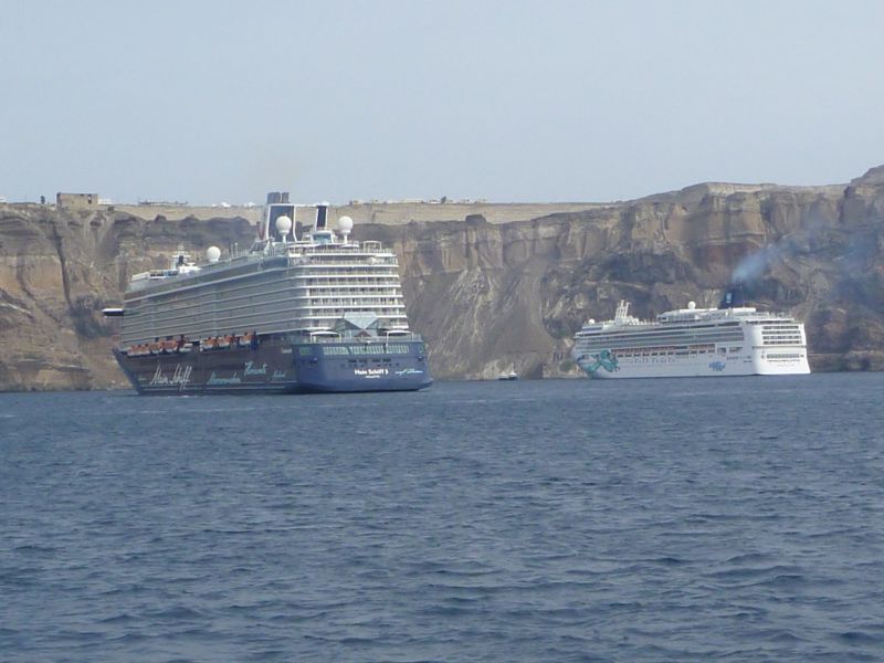 Während wir unsere Runde durch die Caldera drehen, wird die Insel von gleich vier Kreuzfahrtschiffen belagert - darunter auch die "Mein Schiff", deren Konstrukteur wohl nichts von der Wasa gelernt hat.