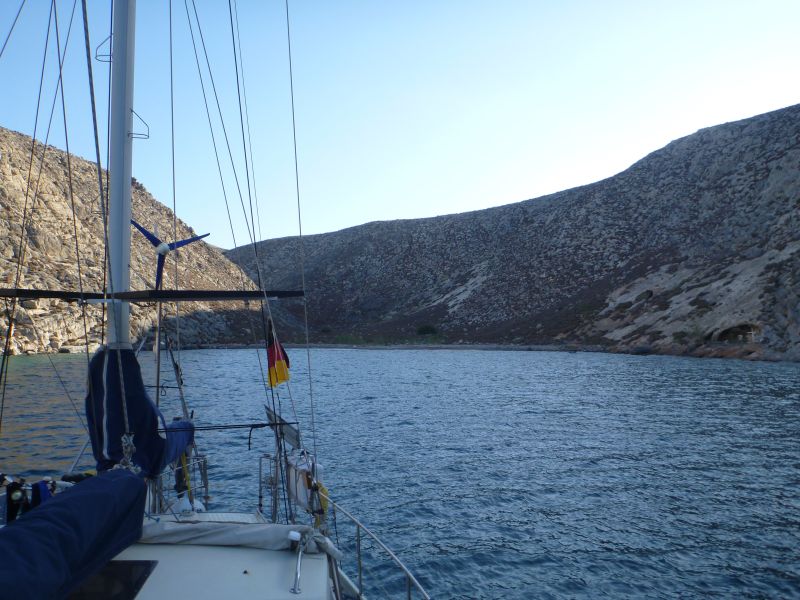 Nach einem Tag Ruhepause, den wir mit Faulenzen, Schlafen und Schwimmen verbringen, nutzen wir den steifen Nordwest um mit Blister und Besan die 30 sm enlang der kretischen Küste in die Lagune von Elounda zurückzulegen. Segeln vom feinsten mit teilweise über 8kn auf der Logge.