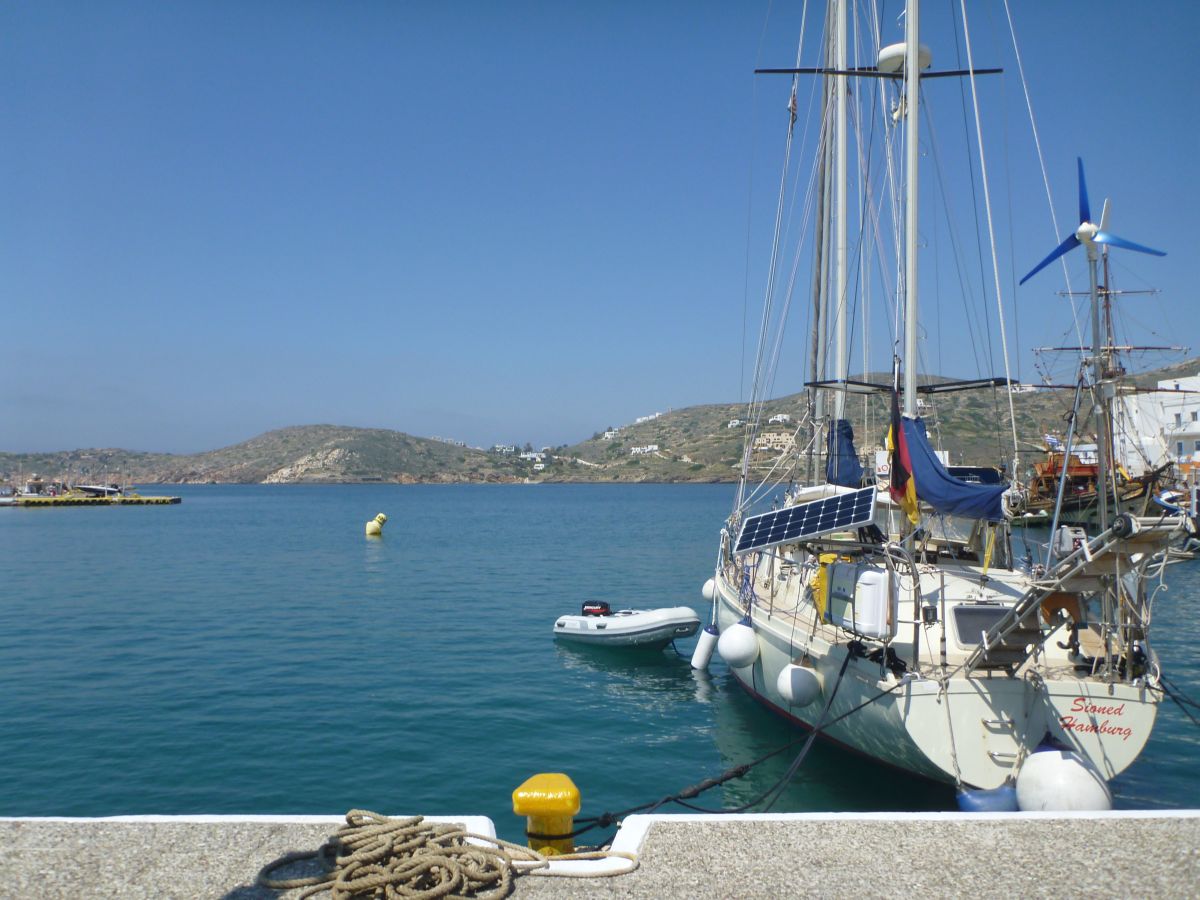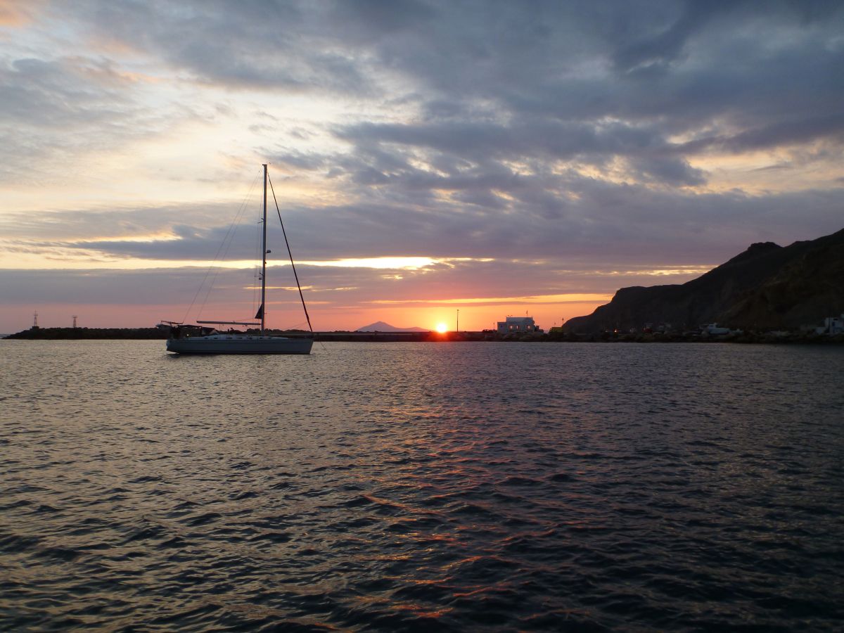 Wir bleiben zwei Tage vor Elounda vor Anker. Der starke Nordwind, der auch am Ankerplatz noch zu spüren ist, macht den Sprung über 60 sm zu den südlichsten Kykladen nicht sonderlich attraktiv. Daher warten wir bis der Wind am Mittwoch etwas zurückgeht und gehen bei Sonnenaufgang Anker auf geniessen das Brummen des Diesels über die nächsten 10 Stunden und kommen noch rechtzeitig zum Sonnenuntergang über Santorin und dank des neuen Watermakers auch mit vollen Wassertanks auf der am weitesten im Südosten gelegegen Kykladeninsel Anafi an.