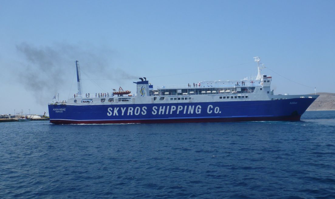 Abends läuft unter den lautstarken Klängen von "Also sprach Zarathustra" die Inselfähre Achilles ein. Die Fähre gehört gemeinsam den Einwohnern der Insel und der Name paßt auch, soll doch auf Skyros der Held Achill (der mit der Sehne) gelebt haben, bis er von Odysseus mit einem Trick in den Krieg gegen Troja gelockt wurde.