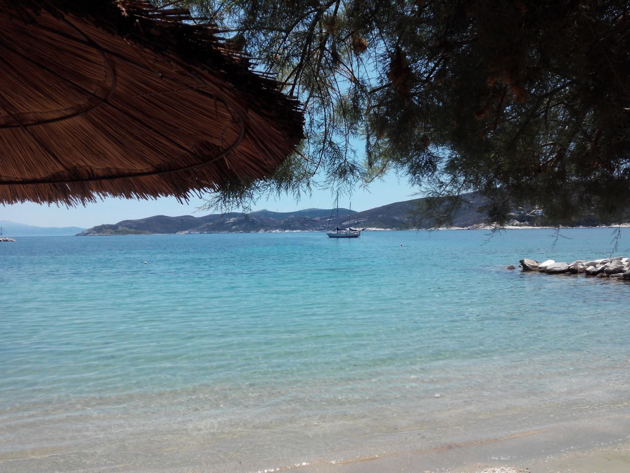 Als der Wind nachläßt und die Kafirea Staße zwischen Euböa und Andros wieder passierbar wird (dort wo wir Anfang Mai über 40kn Wind hatten) tuckern wir weiter nach Petries an der Ost-Seite, der bewährte Zwischenstopp zwischen den Kykladen und Sporaden. Zwei Tage liegen wir hier vor Anker und können vom Strand bei Eis und Ouzo das Schiff im Auge behalten.