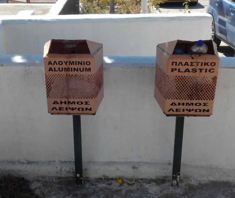 Endlich können wir weiter und springen eine Insel weiter nach Lipsi. Dort können wir in einer schnuckeligen Privatbucht (weil viel mehr als ein Schiff passt nicht rein) ankern. Alles auf Lipsi wirkt sehr gepflegt. Nur unseren gesammelten Müll, den werden wir nicht los. Auf Lipsi herrscht strikte Mülltrennung und Recycling. Selbst die kleinen Mülleimer am Straßenrand sind sortenrein: