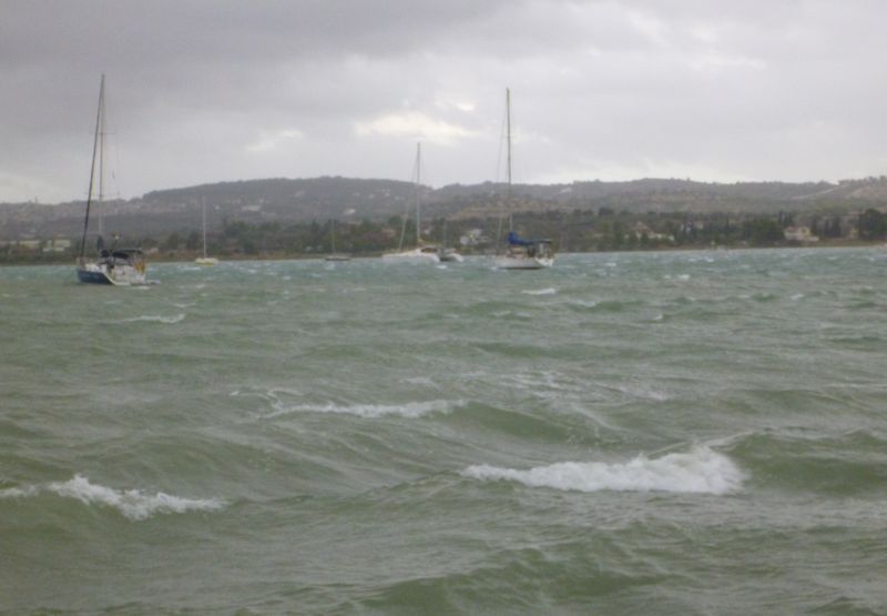 Ermioni ist für dieses Wetter ein denkbar schlechter Ort. Lediglich im inneren Hafenbecken ist ein gewisser Schutz gegegen, aber selbst dort ist man dem in die Bucht einlaufenden Schwell noch ausgesetzt.