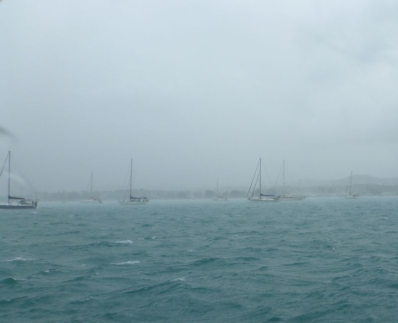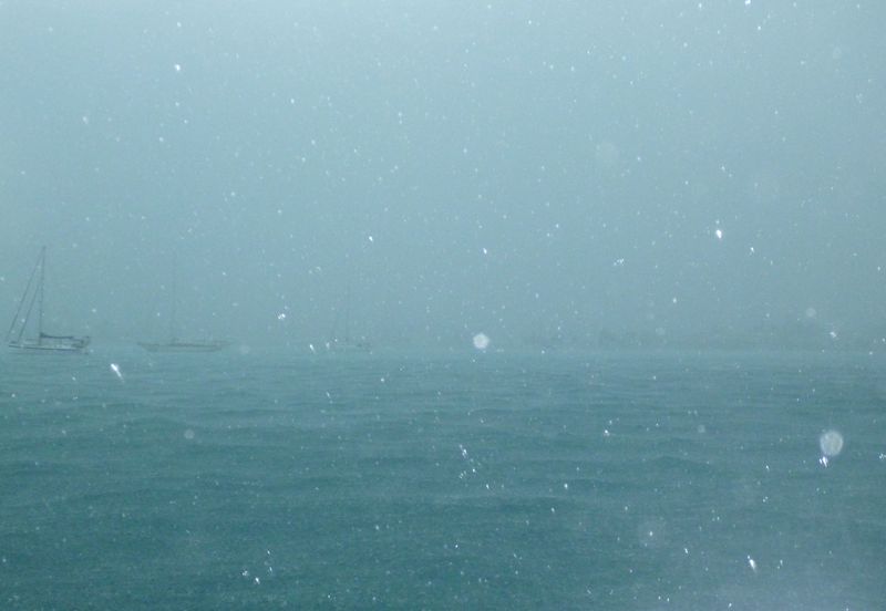 Kaum zwei Stunden später ist das Auge dann auch vorbei gezogen und wir haben wieder 25-35 kn Wind. Diesmal aus WNW. Die Wellen werden nun unangenehmer, da wir nur eine kleine Insel im Eingang der Bucht als Schutz haben. Erst um 3 Uhr in der Nacht geht der Wind auf ein normales Maß zurück.