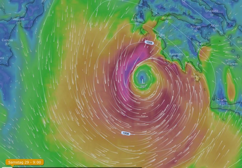 Während ich aufmerksam die Wetterberichte verfolge zeichnet sich die Möglichkeit ab, dass sich das Tief nördlich Libyens, dass und den Starkwind beschert zu einem Medicane (= Mediterranean Hurricane) entwickeln könnte. Diese Biester sind recht selten und treten im Mittelmeerraum vielleicht 1-2 mal im Jahr auf. Diese schweren Stürme haben die Eigenschaften eines tropischen Wirbelsturms, erreichen jedoch selten Katergory 1.