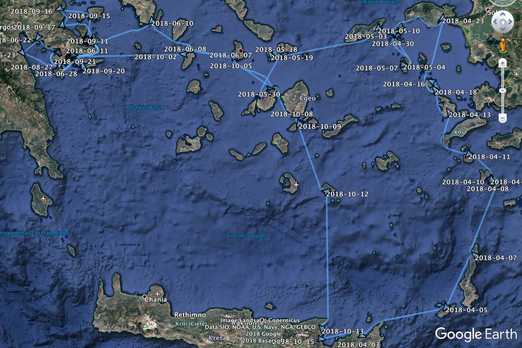 2018 ist Sioned verhältnismäßig wenig herumgekommen. Ca. 1300 sm in 6,5 Monaten. Lange Zeiten vor Anker im Saronischen und Argolischen Golf haben daran Schuld. Aber wir sind ja nicht auf der Flucht.