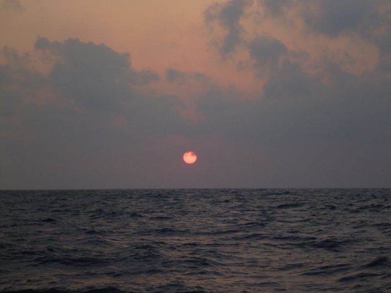 Der Ankerplatz vor der Insel ist wie erwartet unruhig und rollig. So brechen wir am nächsten Tag noch im Dunkeln auf, um genug Zeit für die lange Strecke bis Kreta zu haben. Dafür werden wir (zumindest der Teil der Crew, der sich nach dem Anker auf nicht wieder in die Koje verkrochen hat) mit einem schönen Sonnenaufgang belohnt.