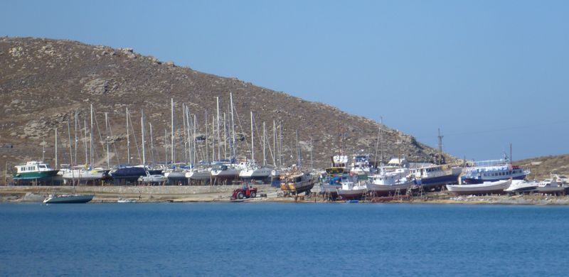 Nach zwei Tagen geht es mit etwas schwächerem Wind und angenehmerer Wellenrichtung dann doch noch nach Paros in die weite Bucht von Naoussa, die bei jeder Windrichtung einen geschützten Ankerplatz bietet. Diesmal suchen wir den vor der kleinen Werft im Norden der Bucht aus.