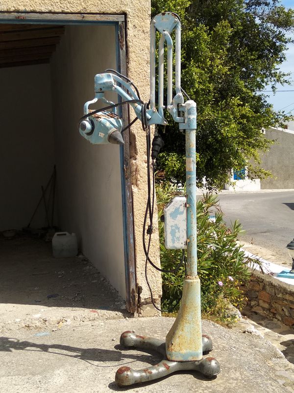 Auf Kasos ist bekanntlich die Zeit stehen geblieben und neben Anafi sicher eine der am wenigsten touristischen Inseln Griechenlands. Trotzdem bekommt man in dem kleinen Ort Fri alles für die Grundversorgung nötige. Nur zum Zahnarzt möchte ich ihr nicht, wenn dieser Röntgenaparat ein Maßstab ist: